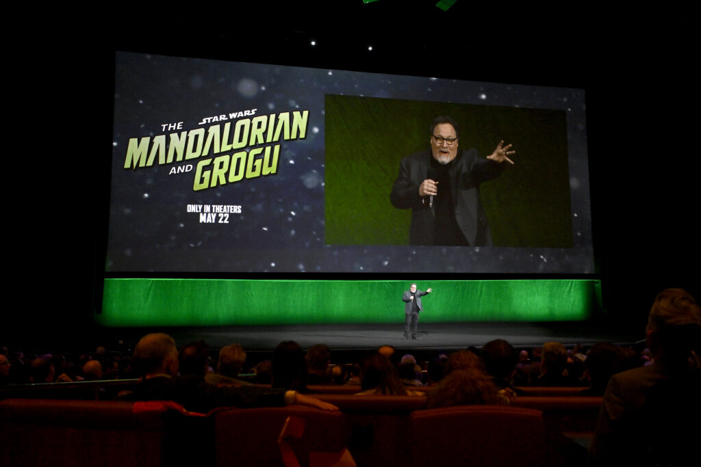 Jon Favreau presentando el avance de Mandalorian y Grogu. Foto por David Becker/Getty Images para la CinemaCon.